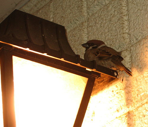 画像は玄関の外の照明の上で寒さをしのぐスズメです。二週間前くらいに見つけて以来、日が暮れるとチョコンと現れます。 |