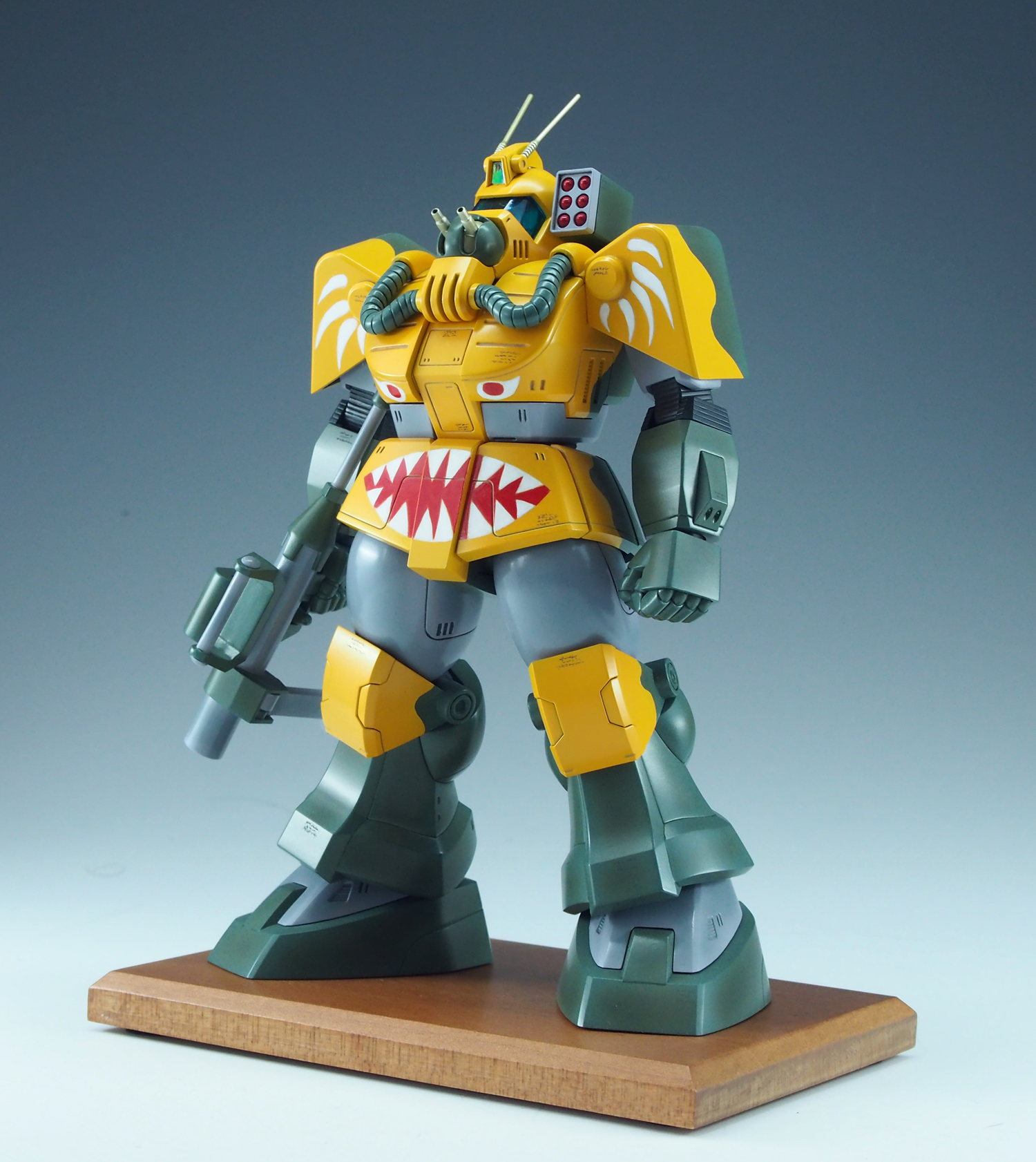 | マックスファクトリー1/72 ブロックヘッドを使用して製作。 工作・・・ 肩アーマーを小型化、肩により密着するように加工、小型の磁石を仕込んで 肩に肩アーマーが取り付けられるようにしています ブロックヘッドはマッシブな人間がシャツを着たらピチピチになった と言うイメージがありますので(わかりにくいイメージ) キットのままだと肩アーマーがどうしても「浮いているように」みえてしまったので手を加えました ヒザアーマーの内側を削って太ももがよりアーマーに密着するように加工、 足首関節周りを削りこんでクツの接地が決まるようにしました 塗装・・・ 小学校低学年の時に見た戦車の図鑑に載っていたアメリカ軍シャーマン戦車の ペイントのビジュアルが強烈で、いつかペイントしたいと思っていたところ ブロックヘッドがペイントを施すモデルにピッタリだなと思い今回のような 塗装を行いました レシプロ機のノーズにペイントされているノーズアートでシャークマウス と言うのがあるのですが戦車は黄色く塗られて「爪」も描かれている事が 多いのでシャークマウスならぬ「タイガーマウス」です マウスを描きやすいように腰中央部出っ張りは削り込んでプラ板を 貼り付け平らにしています タイガーマウス等のペイントはラッカー塗料を薄く薄く希釈して 面相筆を使った筆塗りで縦横斜め・・・を何十回と繰り返して 発色させています、6時間ほど時間がかかっていますが 塗膜は非常に薄く下地との段差がほとんどありません 今回はクリアー塗料によるオーバーコートは行っていません クリアーでコートすると、どうしても「クリアーでコートした質感」 (悪いわけではありません)になってしまうのですが クリアーでコートしない塗りっぱなしの質感も良いものだと 考えています 注意書きなどのデカールを貼り付ける場合、クリアーでコート することによって保護するのですが今回はデカールは使わず エナメル塗料でそれっぽくなるよう注意書きを書き込んでみました ミソは適当に書き込むのではなく注意書きに見えるよう意識して 書き込むことです |