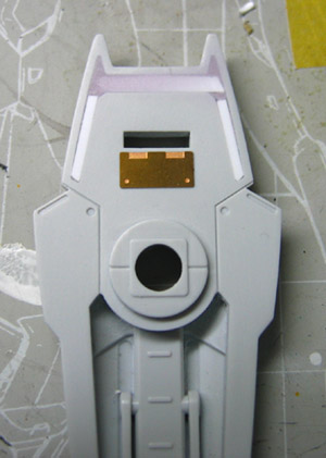 | シールド・・・ シールド上の肉抜き穴をプラ材とパテで埋めています。 下の肉抜き穴はエッチングパーツで塞ぎました。 |