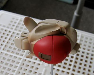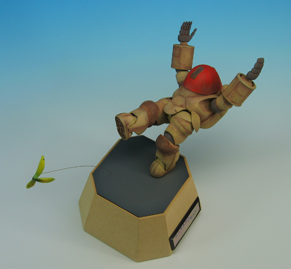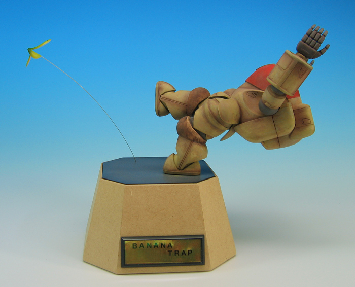 | グンゼ産業より特装機兵ドルバック1/24、PA-36HD-R6ノーブキャノンを使用して製作。 キットはストレートに組んでいます。塗装はエアブラシでベタ塗装後に筆を使ってエナメル塗料による 重ね塗りを行い、パステルを粉状にした物を筆で塗りつけています。 バナナはタミヤの速乾エポパテで製作、パテが黄色地なのを利用してサフレス(メタルプライマーを使用) でクリアーカラーを重ね吹きしています。 |