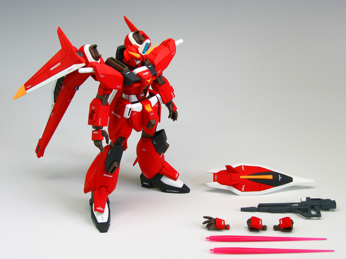 | 改修箇所 頭部・・・ ブレードアンテナを削り込んでシャープに、マスクは削り込んで小型化、 あごはプラ板を貼り付けてから形を整え、目はパテで作り直しています。 マスクのモールドも彫り直してシャープにしています。 首・・・ 市販のパーツをかませて延長しました。 腕部・・・ 前腕は肘間接側の切りかきにプラ板を貼り付けました。少し稼動範囲が狭まりましたが、 見栄えを優先しました。この工作により前腕が少し長く見えるようになります。 手首側は市販のパーツを加工して貼り付け、手首の細い軸とポリキャップが隠れるようにしました。 手はキット以外にハイディテールマニピュレーターの平手3種を用意しました。 肘関節の前面はアッサリしていますのでモールドを彫り、プラ板を加工して貼り付け、 段差をつけて情報量を増やしました。 脚部・・・ つま先はもう少し長い方が見栄えが良いと思いましたので延長してみました。 つま先を延長すると足の甲(白部)との釣り合いが取れなくなりますので ここもプラ板をかませて延長、パテで形状修正しています。 太もも前面の凸モールドは削り取ってスッキリさせています。 膝関節の前面にモールドを彫りました。 バックパック・・・ バックパックとビーム砲を接続するジョイントは肉抜き穴が気になりましたので プラ材とパテで埋めました。 背面に接続されたビーム砲の凸モールドを削り取ってエッチングパーツに置き換えています。 改修画像 塗装・・・ 塗装はGFFなどで行っている塗装法です。 通常はスミイレ後にオーバーコートを 行うのですがつや消しを先にコートして、スミイレし 微妙なスミイレの「にじみ」をだし、スミイレの線も変化をつけます。 スミイレ後にまたつや消しをオーバーコートしますので最もつや消しが 強くなります。塗装の明度、彩度を上げた見た目が 鮮やかな塗装でもあります。 スミイレの調色は色が沈まないように気をつけました。 |