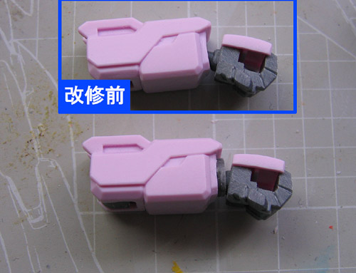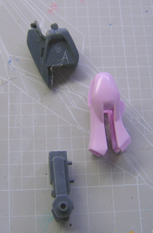 | 脚部・・・ スネのアトハメ加工です。この加工によりマスキングをせずに塗装が出来ます。 作例でも行った加工です。塗装後にグレーの上下パーツはプラモデル用セメントで接着します。 |