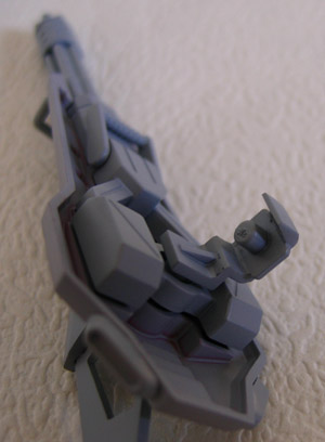| 腕部・・・ 肘関節前面と前腕にプラ板を貼り付けディテールアップし 情報量を追加しています。肩アーマーの〇ディテールに穴を開けて 市販のディテールアップパーツを取り付けています。 |