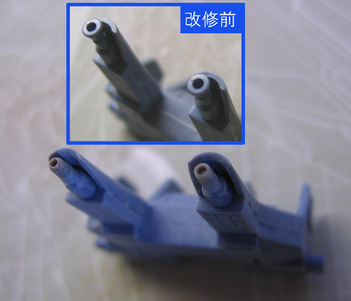 IWSP・・・ 頭部横に突き出る銃口はラッパ状でフチも厚いので市販のディテールアップパーツに 置き換えています。銃口の上のカバーもフチが厚いので削りこんで薄くしています。 115ミリレールガンの砲口内にメッキシルバーで塗装したディテーアップパーツを配置しました。 |