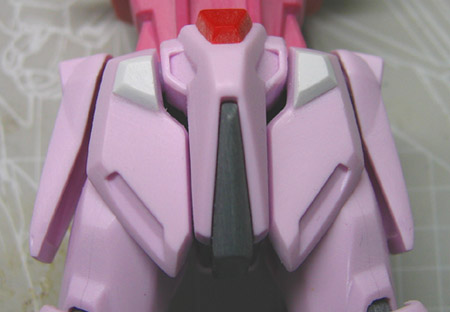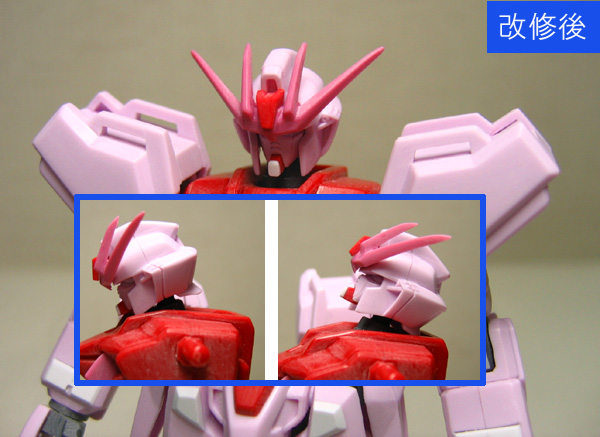 | 頭部・・・ 額のブレードアンテナを削りこんでシャープに、マスクは顎にプラ板を貼り付けて延長し 上下を削りこみ、目は形を整えて印象をパッケージイラストに近づけています。 首は付け根下に前後スイング機構を組み込み、可動範囲を広げています。この工作 は可動範囲を広げると言うより、顎を引いたときのポーズがより自然になる事を 目的としています。 |