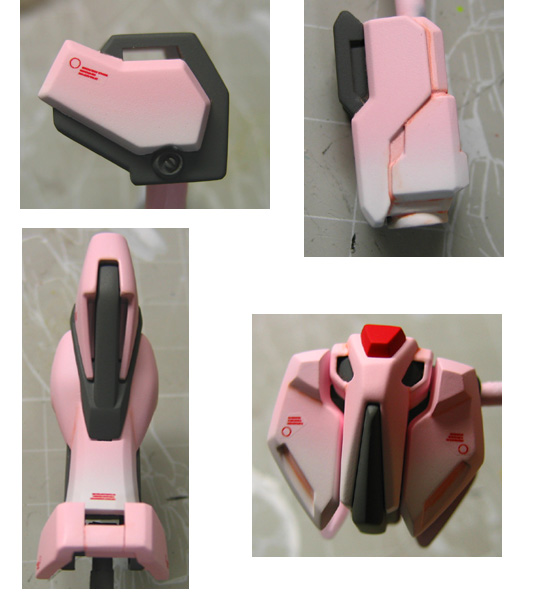 | 本体、グラデーション塗装 肩アーマー、前腕、腰部、スネは ピンク→ホワイトとなるようなグラデーションをかけました。 |