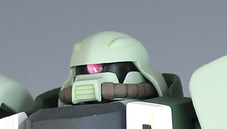 | 改修箇所 頭部・・・ モノアイレーンの上下幅をつめ、モノアイを市販のクリアーパーツに、 ヘルメットを削り込んでシャープに。 シールド・・・突起にパテを盛りシャープに。 脚部・・・太ももをプラ板で3_延長。 手首・・・前腕の接続部が自然になるよう、市販のパーツでカバーを 取り付けています。 背中・・・バックパック接続用の穴を市販パーツで塞いでいます。 塗装はGFFなどで行っている塗装法です。 スミイレの調色は色が沈まないように気をつけました。 |